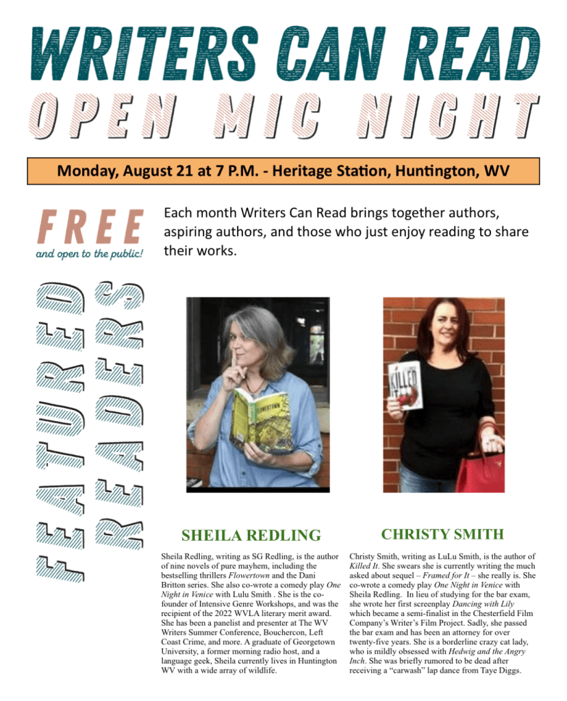 August 21: Writers Can Read @ Heritage Station: 210 11th St, Huntington, WV 25701. Join Sheila Redling and Lulu Smith for a LIVE reading of their current works-in-progress!